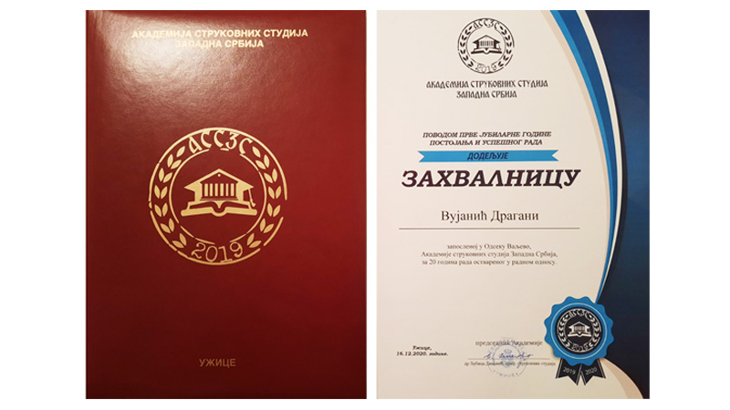 Jubilarna nagrada za dvadesetogodišnji rad u odseku Valjevo pripala je Dragani Vujanić, diplomiranom ekonomisti, zaposlenoj u studentskoj službi Akademije na poslovima samostalnog stručnotehničkog saradnika za studije i studentska pitanja. Kao alumnista ove ustanove, a sada zaposlena, Dragana je povodom jubileja istakla sledeće: