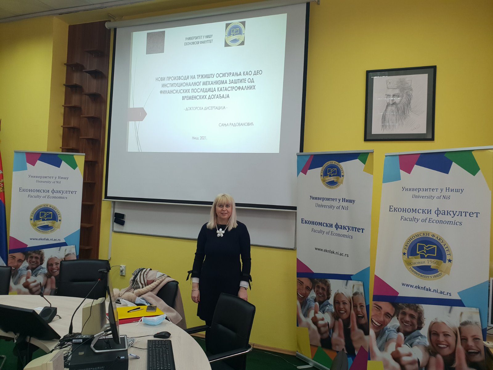 Doktorsku disertaciju naša profesorka je odbranila pred komisijom koju su činili dr Jelena Kočović, redovni profesor Ekonomskog fakulteta Univerziteta u Beogradu, dr Evica Petrović, redovni profesor Ekonomskog fakulteta Univerziteta u Nišu i dr Srđan Marinović, redovni profesor Ekonomskog fakulteta Univerziteta u Nišu.